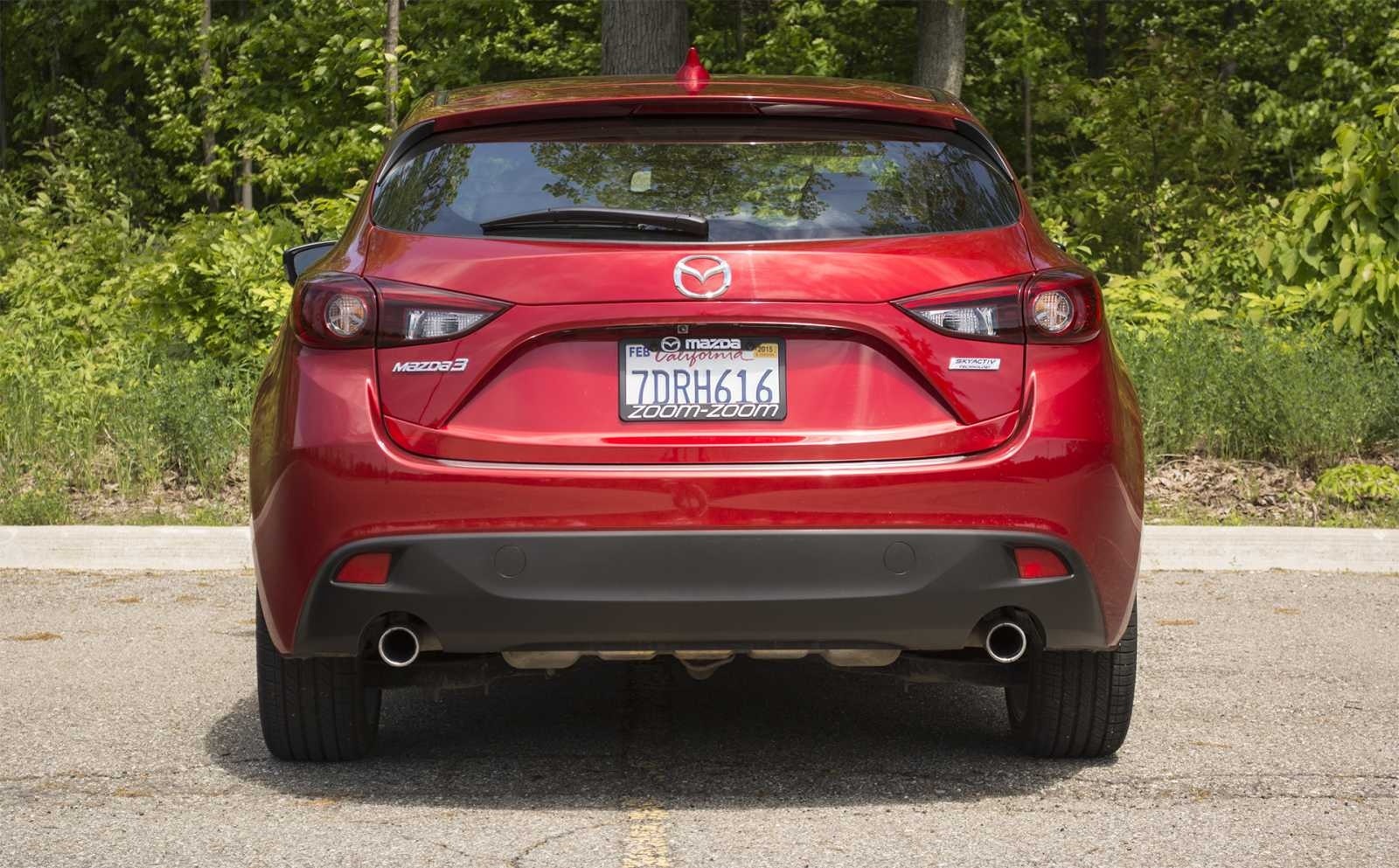 The 2014 Mazda3 s Grand Touring Hatchback presents a symmetrical rear view in Soul Red Metallic, showing off the full-width taillights, integrated hatchback spoiler, and dual exhaust tips set into a sculpted lower diffuser. The "Mazda3" badging and California "Zoom-Zoom" dealer plate frame add authenticity to this real-world press shot.
