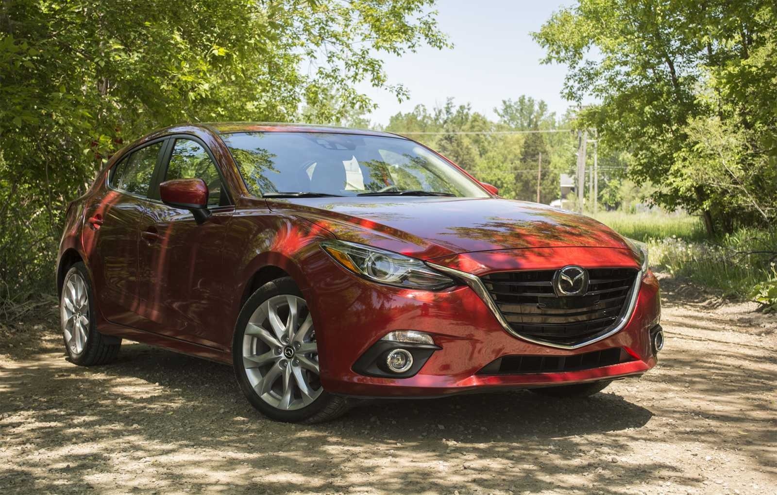 2014 Mazda3 s Grand Touring Hatchback Soul Red front three-quarter view on wooded dirt road