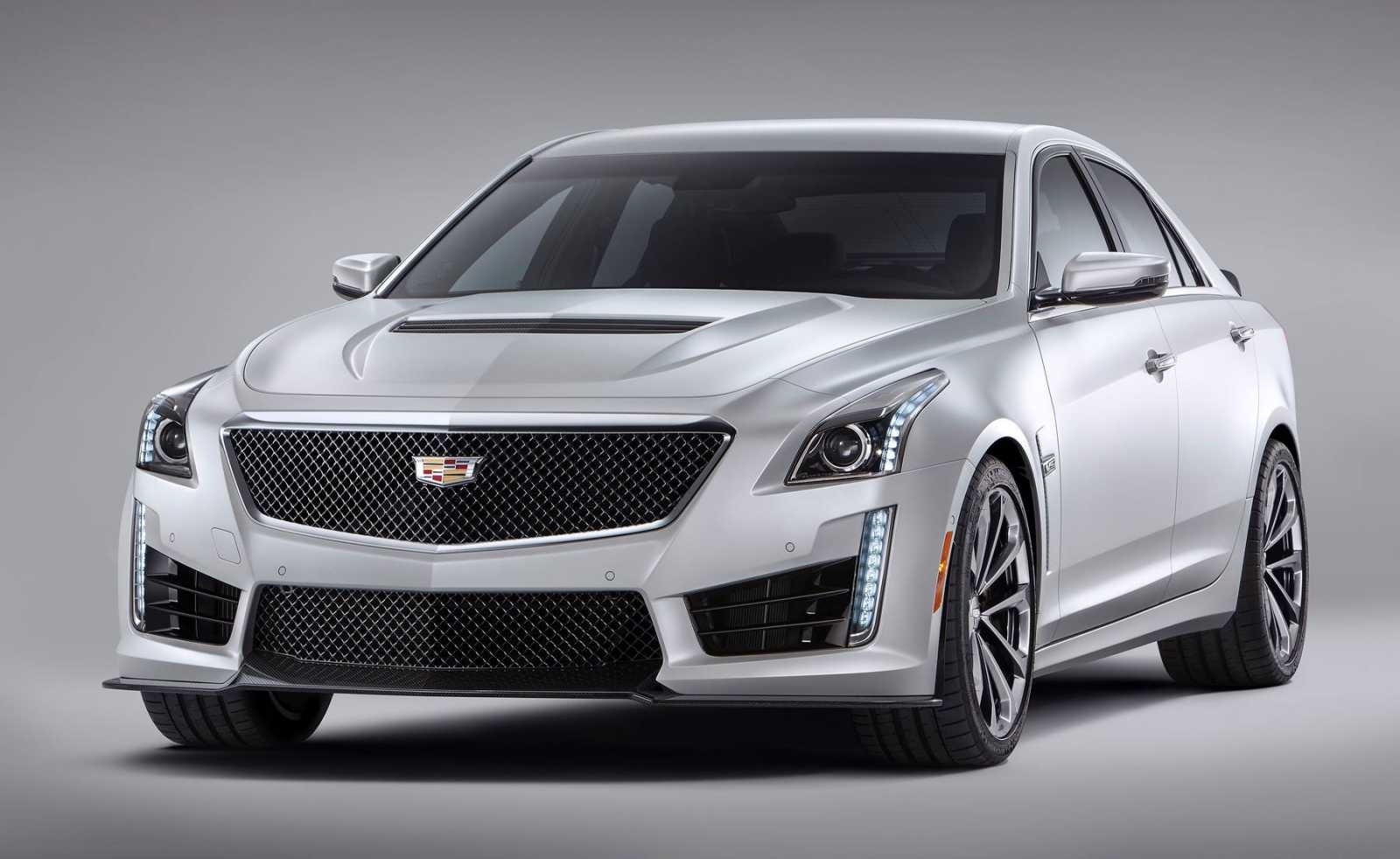 In silver against a neutral studio backdrop, the 2016 Cadillac CTS-V's front three-quarter view highlights the aggressive mesh grille, sculpted hood with functional extractor vent, and angular LED daytime running lights that define its performance character. The wide stance and large-diameter wheels reinforce that this is the most capable CTS ever built.