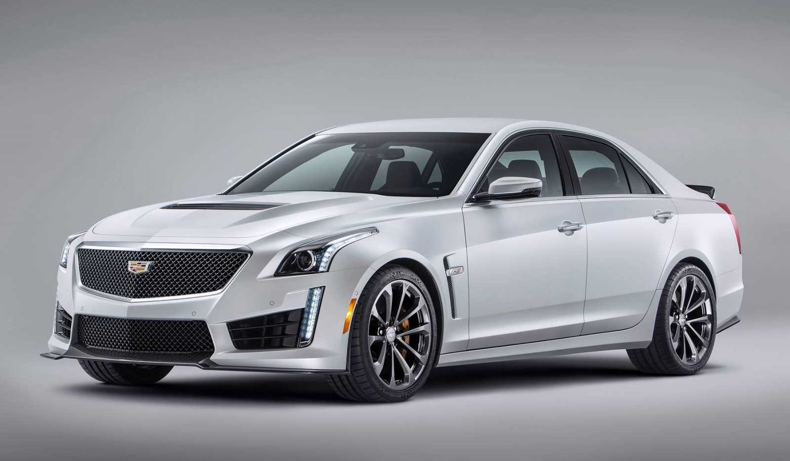 This silver 2016 Cadillac CTS-V in studio lighting features black multi-spoke wheels and a carbon fiber hood insert consistent with a performance package, giving the sedan an even more aggressive visual stance. The carbon fiber lower splitter and side rocker extensions complete the track-inspired appearance.