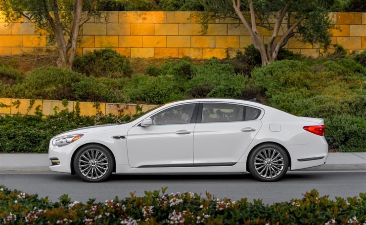 2015 Kia K900 — White Side Profile Parked Against Landscaped Wall