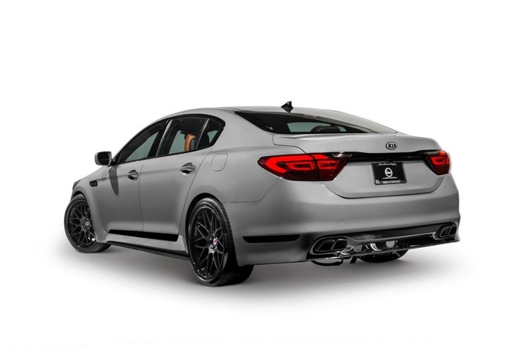 This studio shot shows a heavily customized 2015 Kia K900 in matte gray with an aggressive performance makeover including dark mesh HRE wheels, carbon fiber rear diffuser, quad exhaust tips, and lowered suspension. The concept build demonstrates the K900 platform's potential as a performance-oriented luxury sedan well beyond its stock configuration.