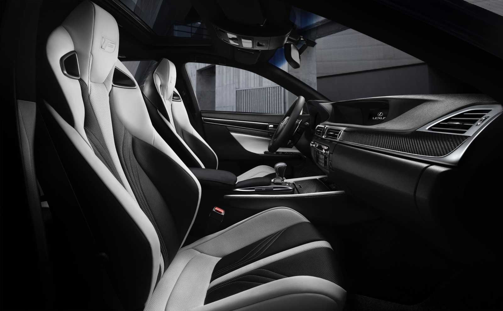 The 2016 Lexus GS-F's cabin pairs heavily bolstered sport seats in white and black leather with carbon fiber trim across the dash and center console. The driver-focused cockpit layout reinforces the GS-F's track-capable character without sacrificing Lexus refinement.