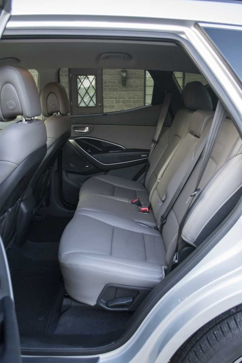 The rear seat of the 2014 Hyundai Santa Fe Sport 2.0T offers two-tone gray leather upholstery with individual headrests and a wide bench layout. Adequate legroom is visible in this door-open view, along with the armrest-equipped door panel and light-colored headliner.