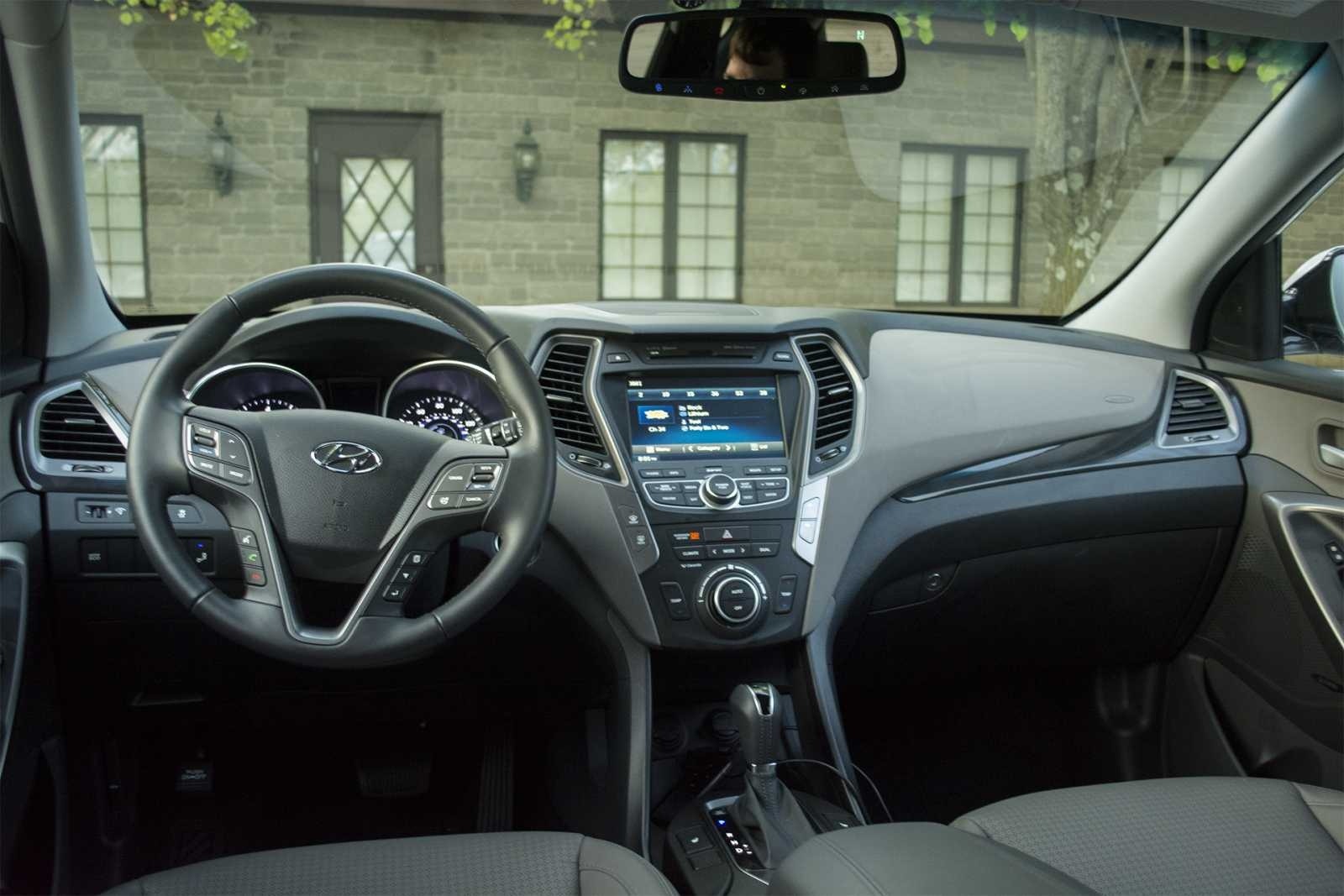 The 2014 Hyundai Santa Fe Sport 2.0T's dashboard features a touchscreen infotainment display flanked by climate controls, a leather-wrapped three-spoke steering wheel with integrated audio and phone controls, and a two-tone gray and silver trim scheme. The automatic gear shifter, instrument cluster, and auto-dimming rearview mirror complete the well-appointed cockpit.