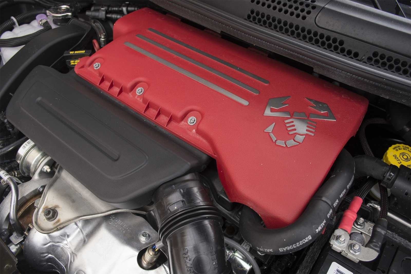 The turbocharged 1.4-liter MultiAir engine wears a bold red cam cover embossed with the Abarth scorpion emblem, a visual reminder that this is no standard 500 powerplant. The cover is a deliberate piece of theater, ensuring the engine bay makes as strong a statement as the rest of the car.