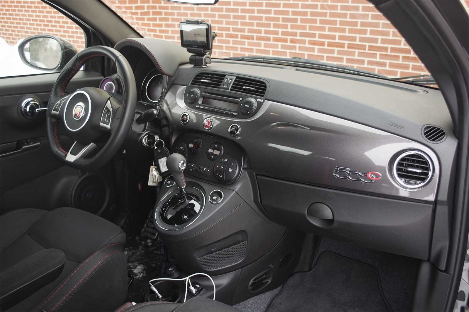 Shot from the passenger side, the 500C Abarth's dashboard shows the retro-styled instrument pod, body-colored dash panel with 500 badging, and the centrally mounted radio and HVAC controls stacked in the console. The Abarth steering wheel and short-throw manual shifter frame the driver's workspace in a cabin that blends Italian style with hot-hatch intent.