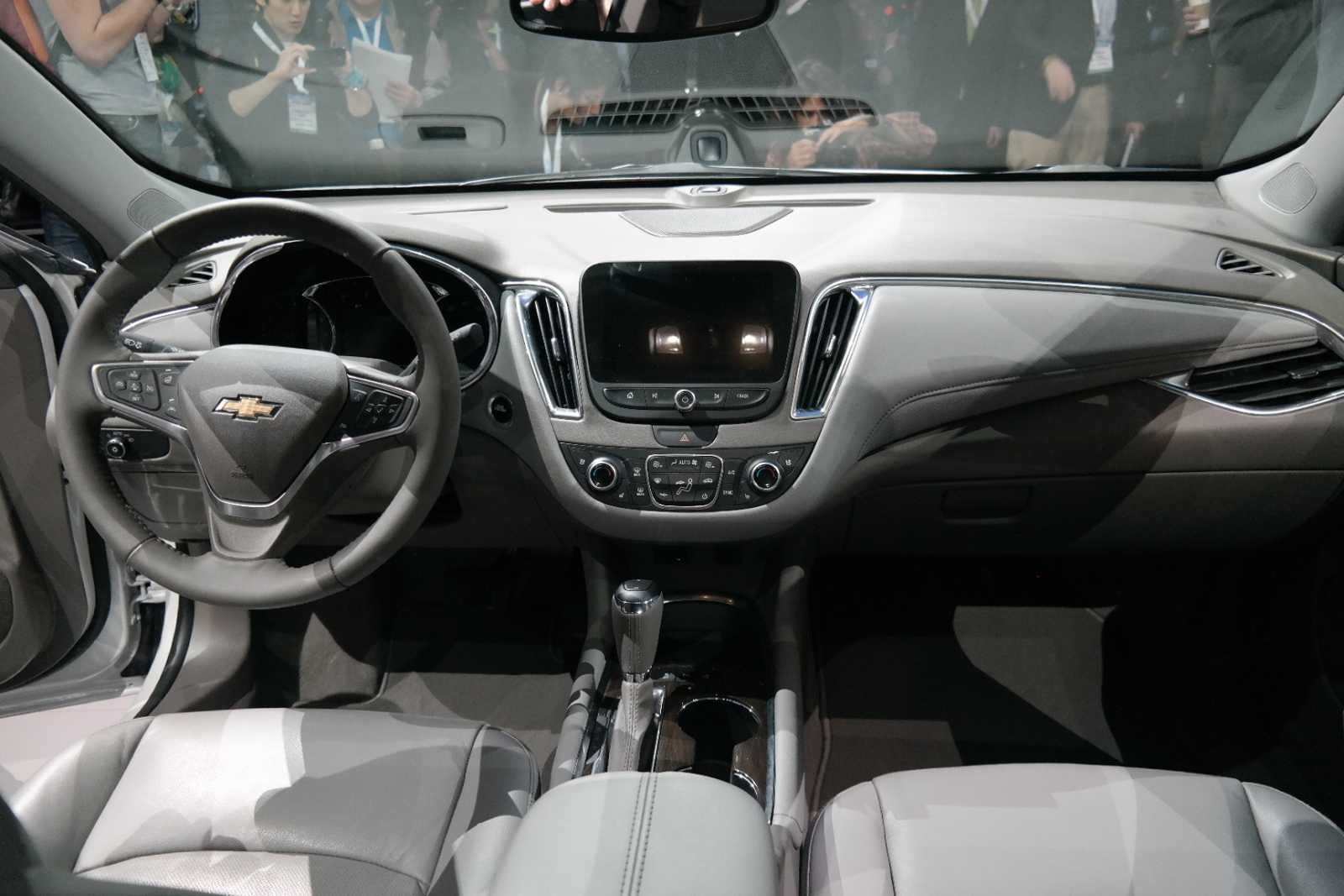 The 2016 Chevrolet Malibu's redesigned interior features a driver-focused cockpit with a floating center stack, MyLink touchscreen infotainment, and a light gray color scheme with soft-touch surfaces. The steering wheel-mounted controls and revised instrument cluster reflect a significant step forward in interior quality over the outgoing generation.