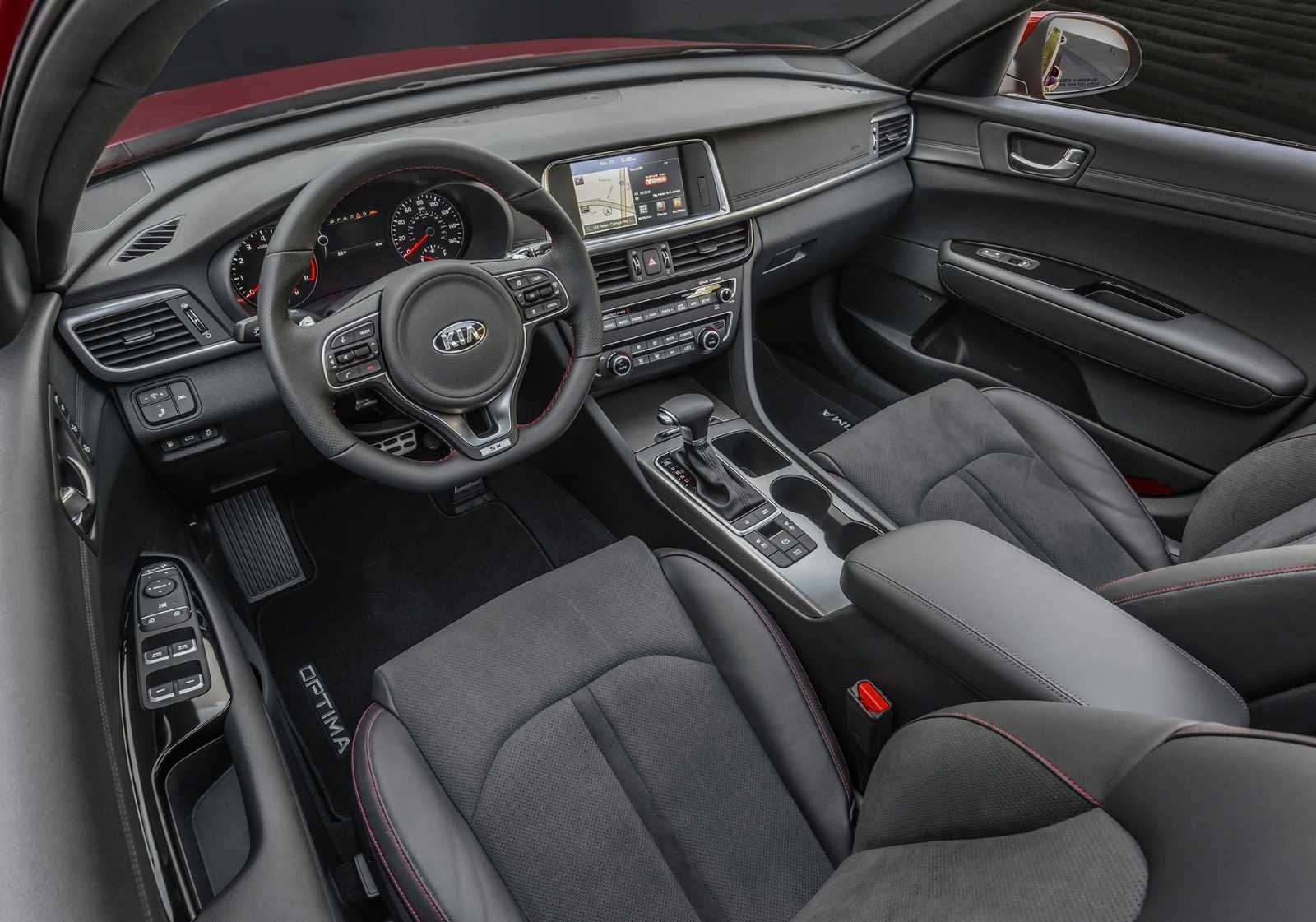 A wide view of the 2016 Kia Optima EX cabin reveals sport-bolstered front seats with red stitching, Optima-branded floor mats, and a center console with automatic transmission shifter. The infotainment screen and instrument cluster are clearly visible from this driver-side vantage point.