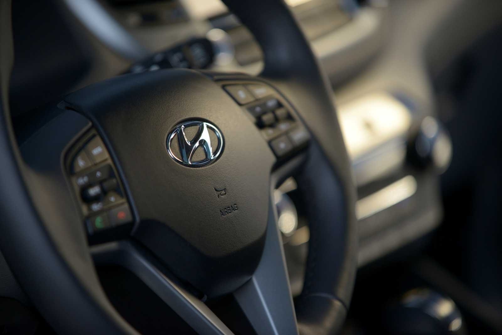 A close-up of the 2016 Hyundai Tucson Sport center console shows the leather-wrapped gear shifter, chrome trim accents, and heated seat and drive mode controls. The premium console finishes give the interior an upscale feel.