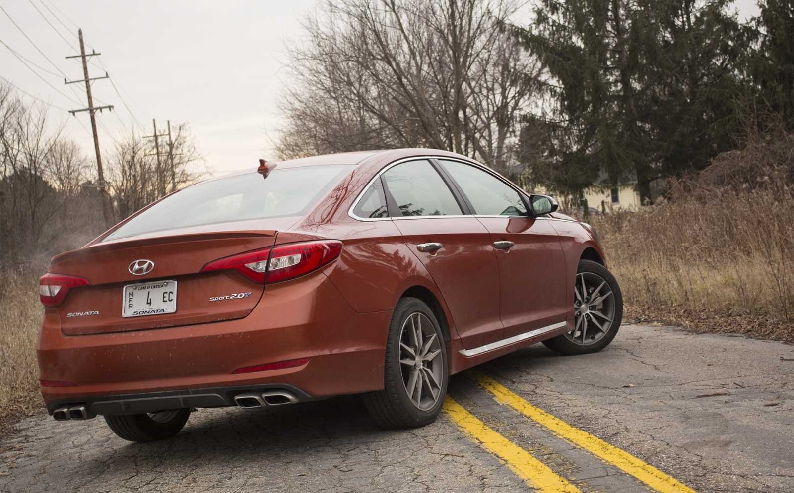 The rear three-quarter view of the 2015 Hyundai Sonata Sport 2.0T shows the fastback roofline flowing into a sculpted decklid, with "SONATA" and "Sport 2.0T" badging flanking the Hyundai H badge and quad exhaust tips visible below the dark lower diffuser. The Illinois press car plates identify this as a media vehicle photographed on a rural dead-end road in winter.