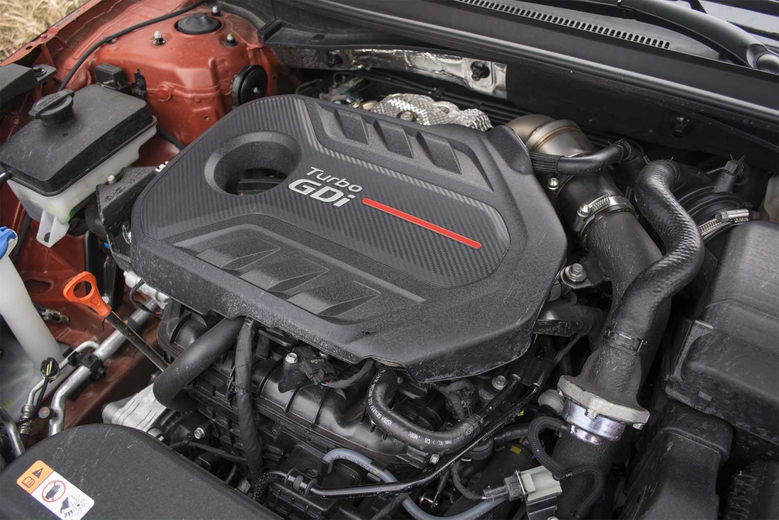 A tighter shot of the 2.0-liter Turbo GDi engine cover in the Sonata Sport 2.0T, showing the carbon-fiber-patterned engine cover with "Turbo GDi" lettering and a red accent stripe. The turbocharged direct-injection setup gives the Sport 2.0T a clear performance advantage over the naturally aspirated 2.5-liter four-cylinder in lower Sonata trims.