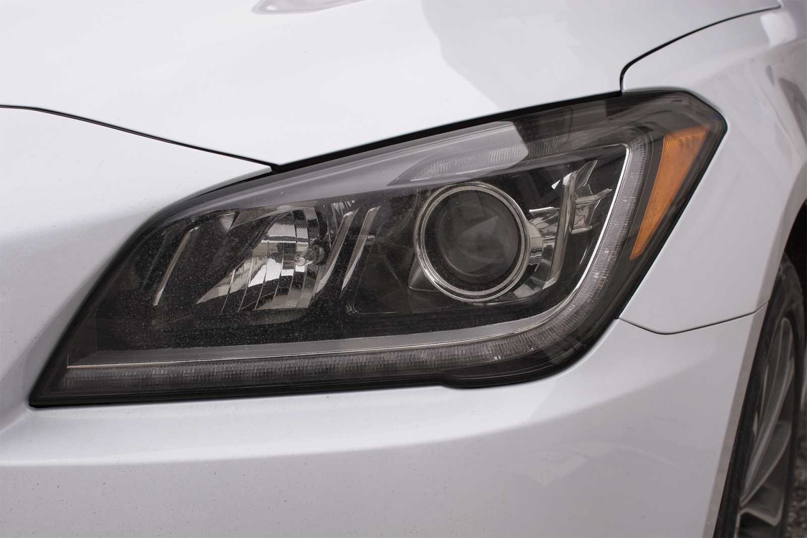 A close-up of the 2015 Hyundai Genesis 3.8's driver-side headlight shows the projector HID bulb surrounded by a swept dark housing with an amber corner marker. The angular lid design sweeps rearward into the long hood, emphasizing the car's premium character.