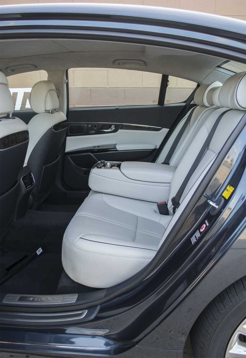 The rear cabin of the 2015 Kia K900 V8 features expansive white leather seating with generous legroom and a wide center armrest, giving the interior a first-class feel. Dark wood trim accents the door panel and center console area, while individual rear climate vents and a sunroof overhead round out the luxury appointments.