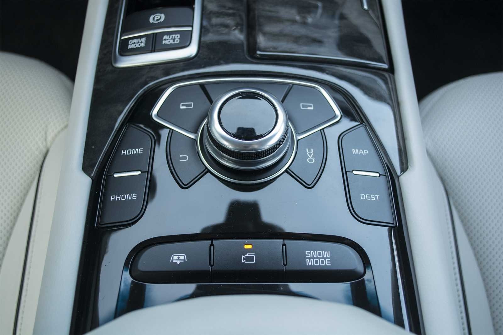 The center console of the 2015 Kia K900 V8 features a rotary infotainment controller surrounded by shortcut buttons for Home, Phone, Map, and Destination functions, all set in a gloss black and dark wood trim panel. Below it, a row of buttons includes a Snow Mode toggle with an amber indicator light, reflecting the K900's broad dynamic ambitions.