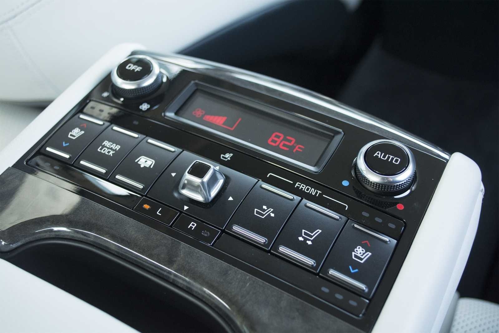 The rear center console of the 2015 Kia K900 V8 houses a dedicated climate panel showing 82 degrees Fahrenheit on a red LED display, with an Auto knob, heated and cooled seat buttons, and massage controls for both left and right rear passengers. The array of controls highlights the K900's commitment to rear-seat luxury on par with established European rivals.