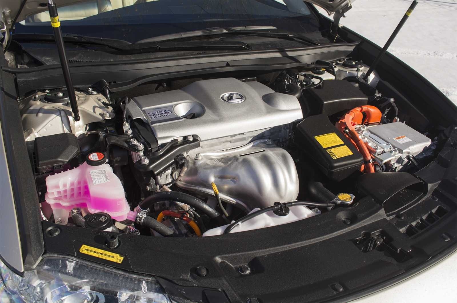 The engine bay of the 2015 Lexus ES 300h reveals its 2.5-liter Atkinson-cycle four-cylinder paired with an electric motor, with the orange high-voltage hybrid cabling visible on the right side. The Lexus-badged engine cover sits prominently atop the clean, well-organized bay.