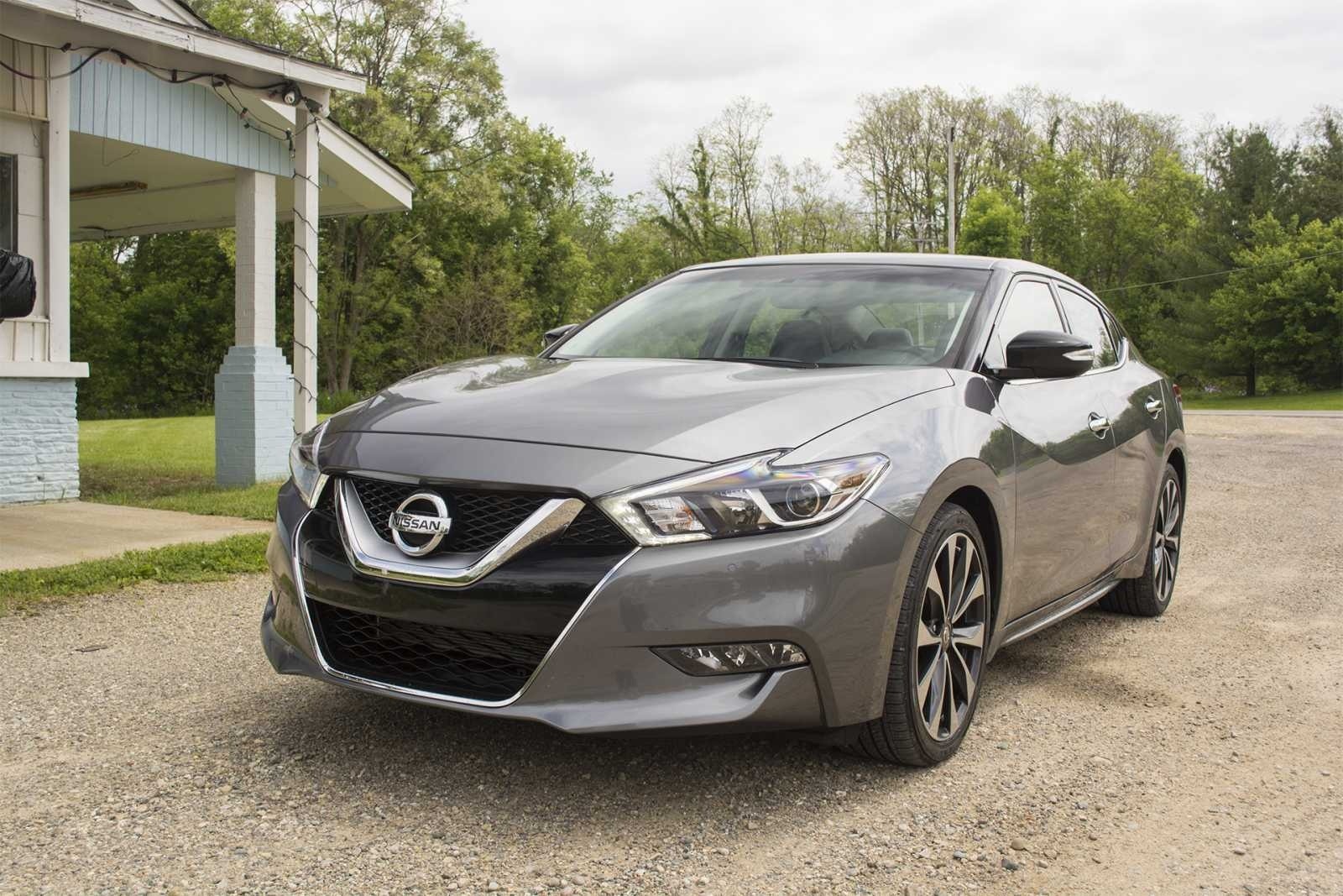 The 2016 Nissan Maxima SR in Gun Metallic gray shows its sporty front fascia and 19-inch diamond-cut alloy wheels from a three-quarter front angle. The SR trim adds sport-tuned suspension and paddle shifters for a more driver-focused experience.