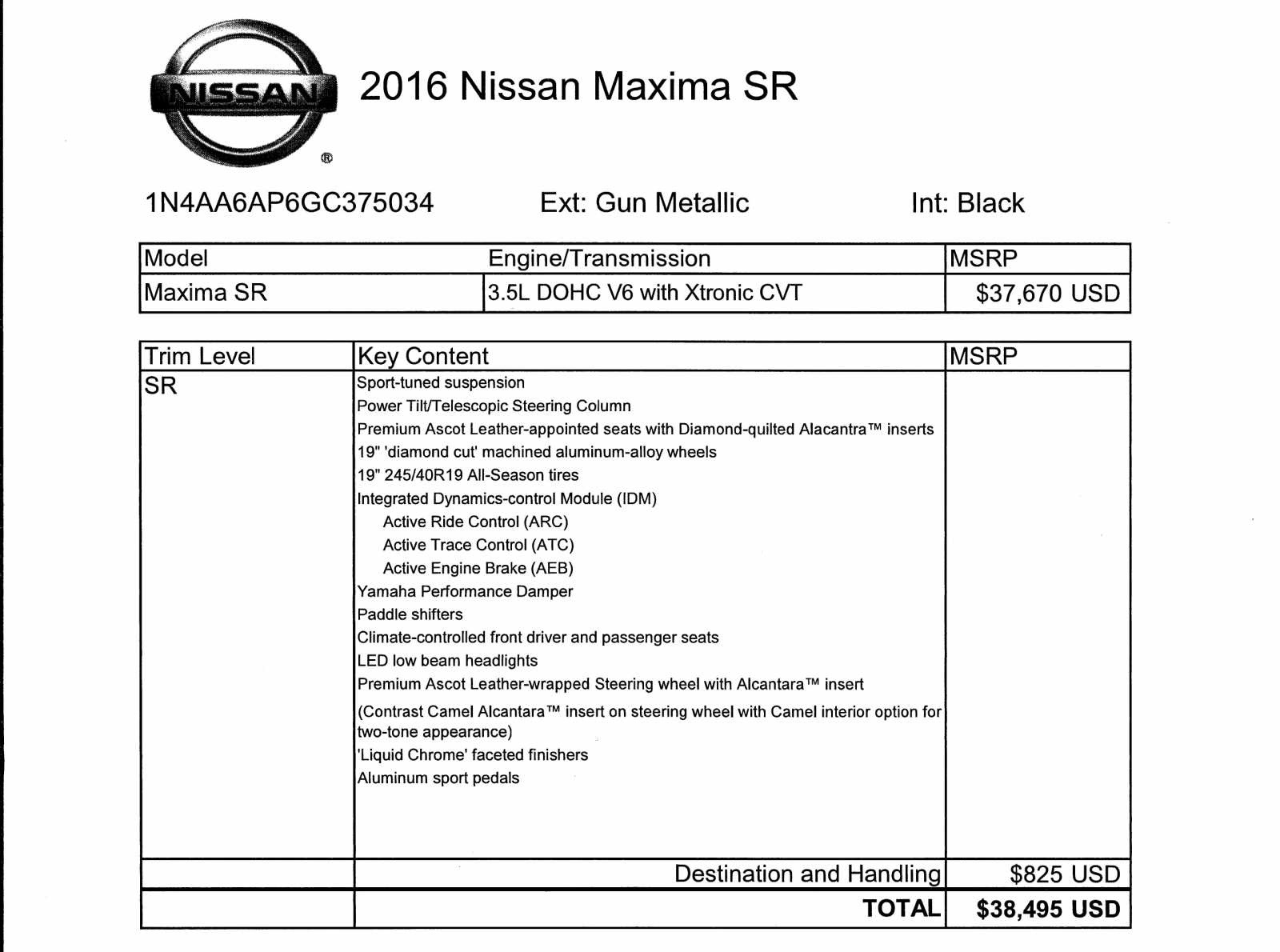 The window sticker for the 2016 Nissan Maxima SR shows the Gun Metallic exterior, Black interior, 3.5L DOHC V6 with Xtronic CVT, and an MSRP of $38,495 including destination. SR-specific features include sport-tuned suspension, Yamaha Performance Damper, and paddle shifters.