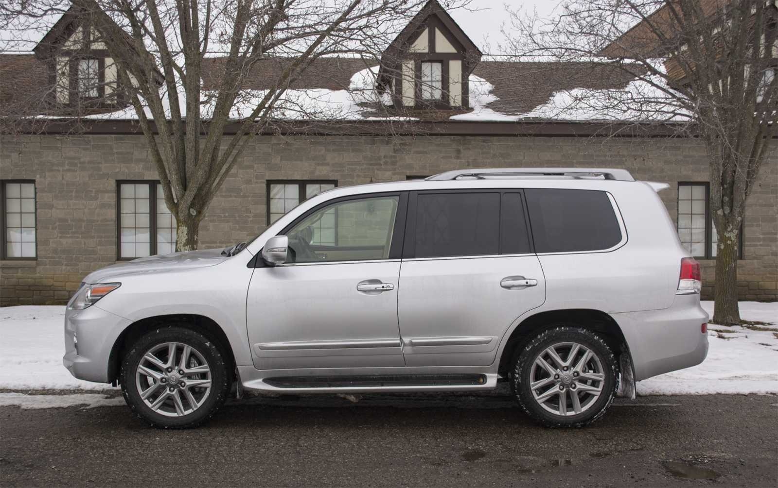 The full-size silver 2015 Lexus LX 570 stretches across the frame in a side profile view, revealing its three-row body-on-frame proportions, running boards, and large multi-spoke alloy wheels. The tall roofline and wide stance reinforce the SUV's off-road capable character.