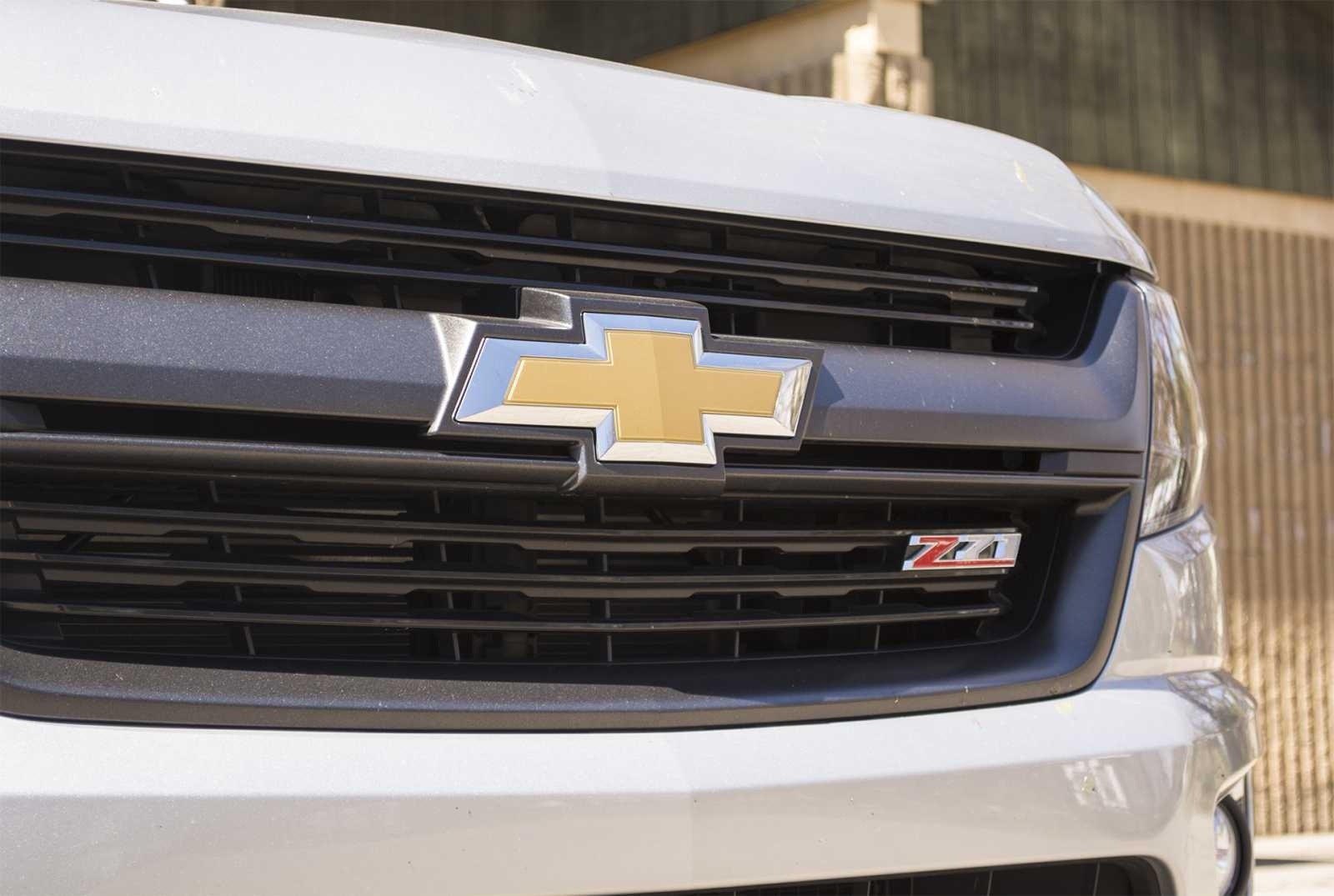 A close view of the 2015 Chevrolet Colorado Z71's blacked-out front grille, featuring the gold bowtie emblem front and center with the red and silver Z71 badge below it. The dark grille treatment gives the off-road-focused trim a more aggressive look than standard Colorado models.