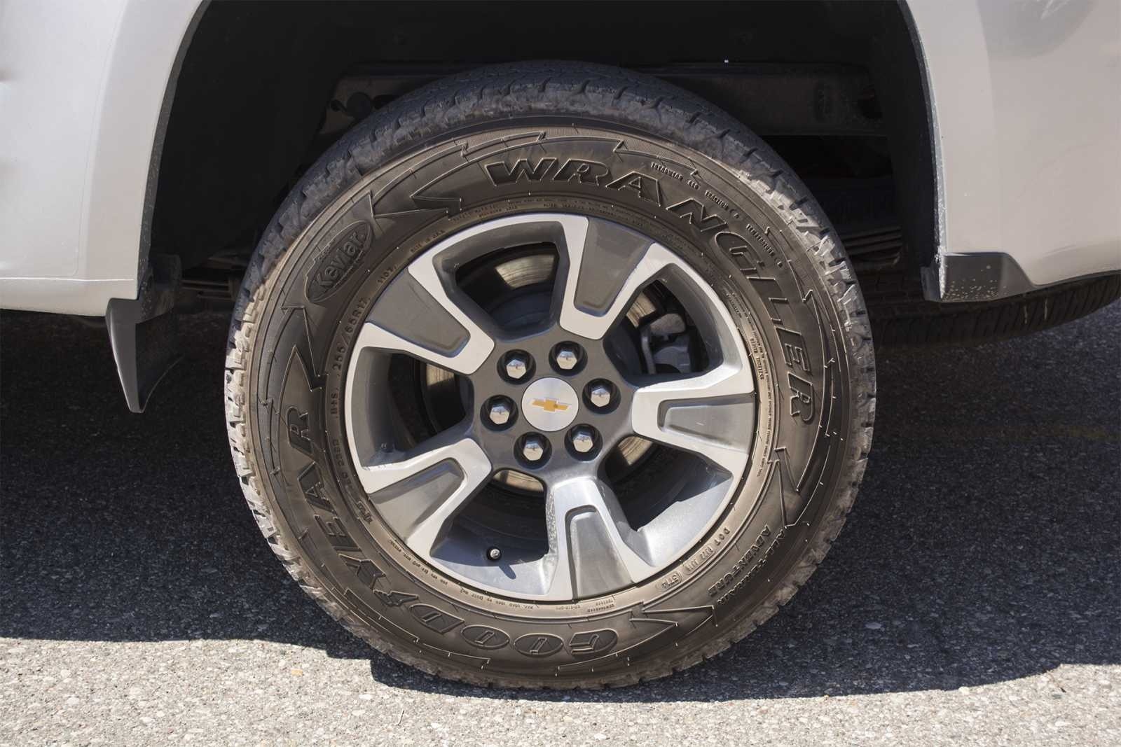 The 2015 Chevrolet Colorado Z71 rolls on a machined five-spoke alloy wheel shod with a Goodyear Wrangler all-terrain tire, providing the off-road grip and on-road manners expected from the Z71 package. The Chevy bowtie center cap completes the rugged-yet-refined wheel design.
