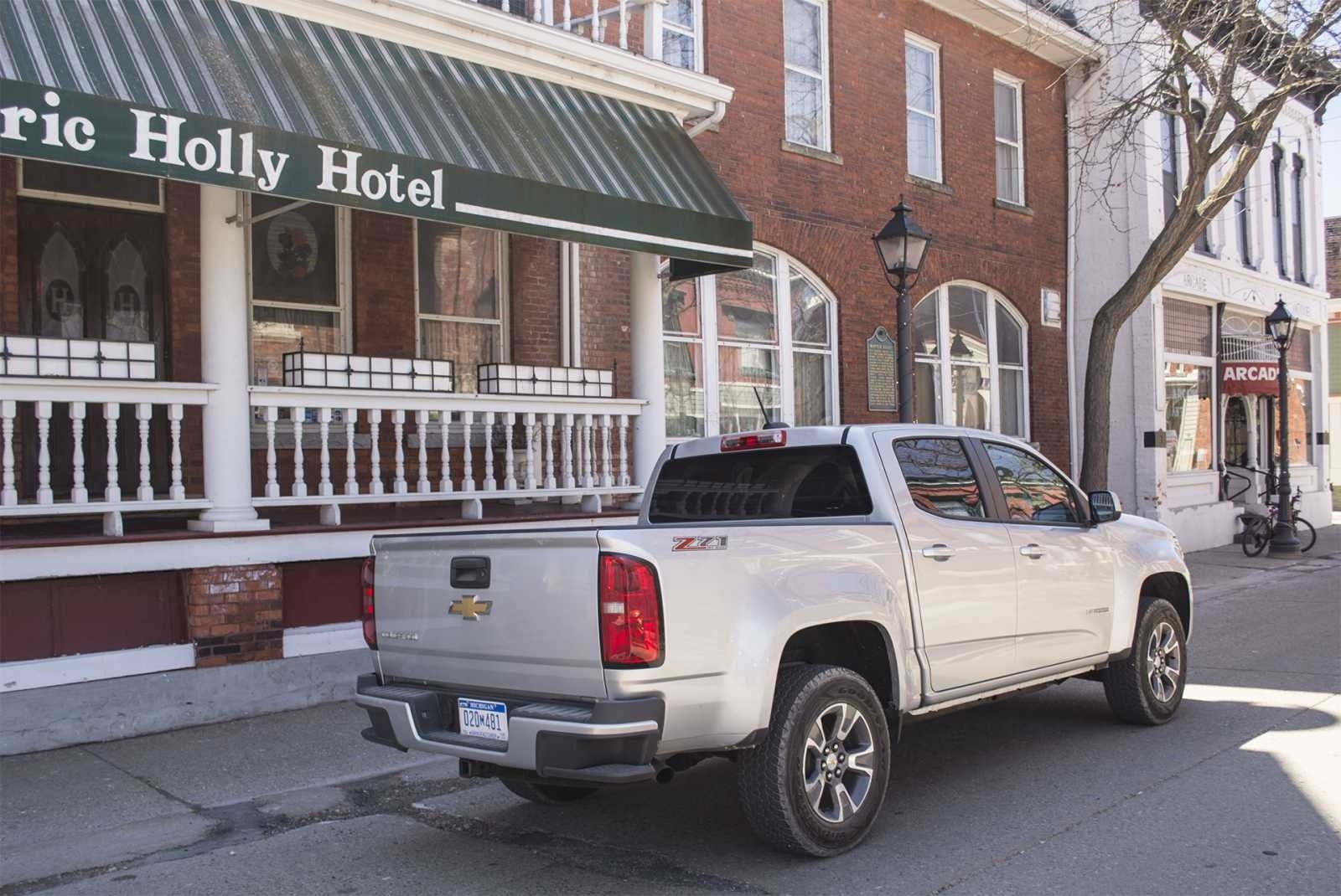 The 2015 Chevrolet Colorado Z71 Crew Cab is parked on the main street of Holly, Michigan, with the Historic Holly Hotel visible in the background, illustrating the truck's easy urban drivability. The rear three-quarter view shows the clean tailgate, vertical taillights, and Z71 bedside graphics.