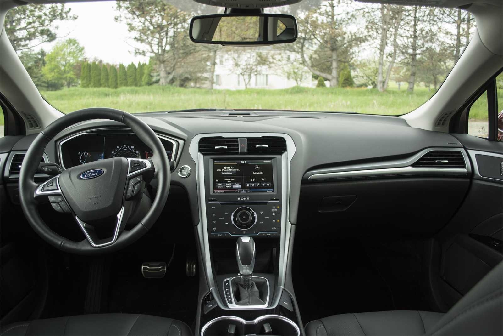 Full panoramic view of the 2015 Ford Fusion Titanium AWD dashboard featuring the Sony premium audio system, SYNC infotainment touchscreen, dual-zone climate controls, and leather-wrapped steering wheel.