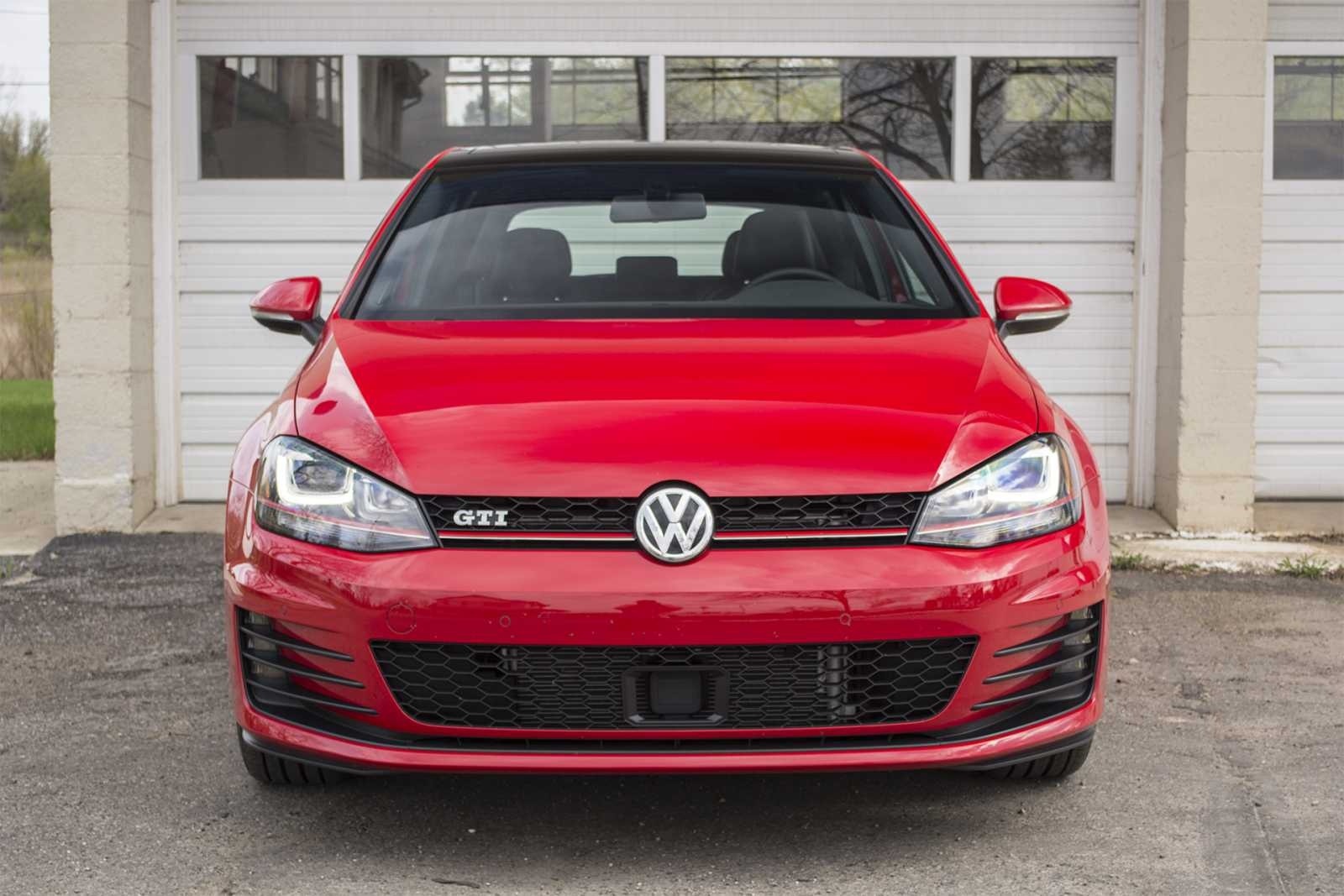 The seventh-generation GTI's front fascia presents a purposeful face, with its signature red-accented honeycomb grille, GTI badge, and bi-xenon projector headlights announcing its performance intent without shouting. Clean, tight panel gaps and a sculpted hood give the red exterior a polished, almost understated aggression.