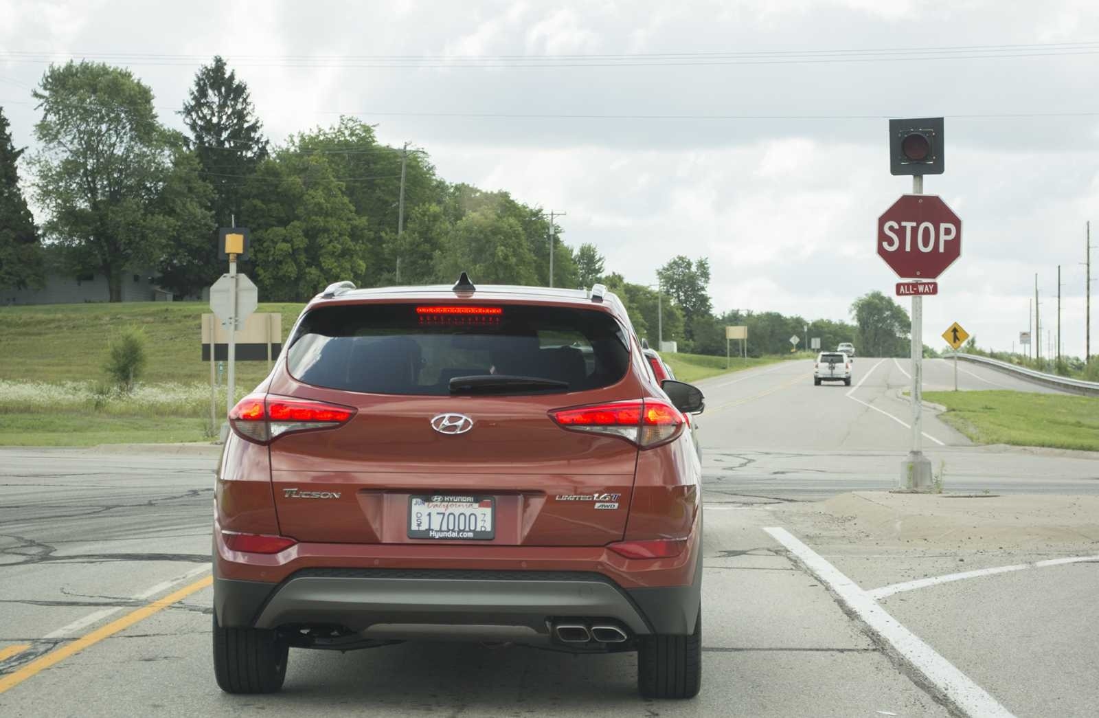Seen from directly behind at a rural all-way stop, the bronze 2016 Hyundai Tucson Limited 1.6T shows off its full-width tailgate, LED-accented taillamps, and dual chrome exhaust tips. The Limited 1.6T badge is visible just above the rear bumper.