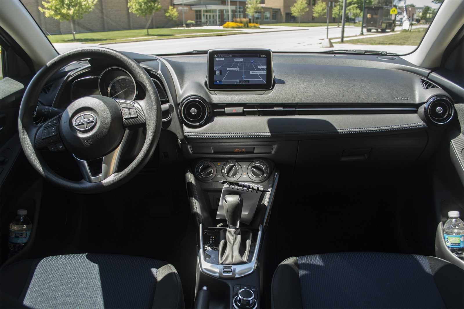 The 2016 Scion iA's driver-focused cockpit features a clean, minimalist dashboard layout with a central touchscreen infotainment display, simple rotary climate controls, and a leather-wrapped steering wheel bearing the Scion badge.