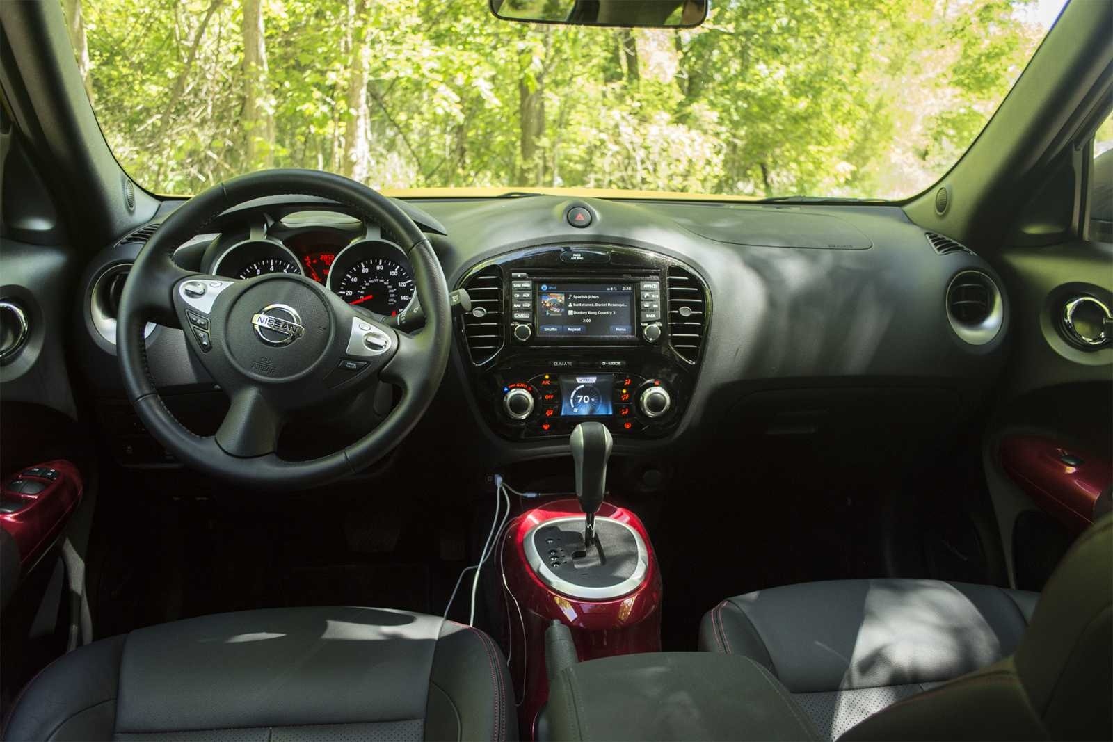 The full dashboard of the 2015 Nissan Juke SL AWD shows the NissanConnect touchscreen displaying audio and climate information, flanked by the Juke's round pod instrument cluster and spherical air vents. The gloss red center console with CVT shifter anchors the cabin, while the leather seats and dark headliner give the cockpit a sport-focused feel.
