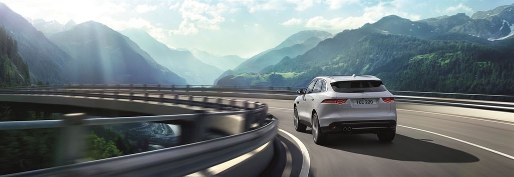 2017 Jaguar F-Pace Exterior Rear Trailing Shot Alpine Highway White