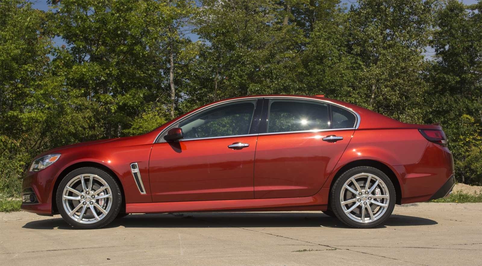 A clean side profile of the 2015 Chevrolet SS in deep red reveals its long hood, fastback roofline, and flush door handles on a low, athletic body. The multi-spoke alloy wheels and subtle fender vents add to the understated but purposeful design of this performance sedan.