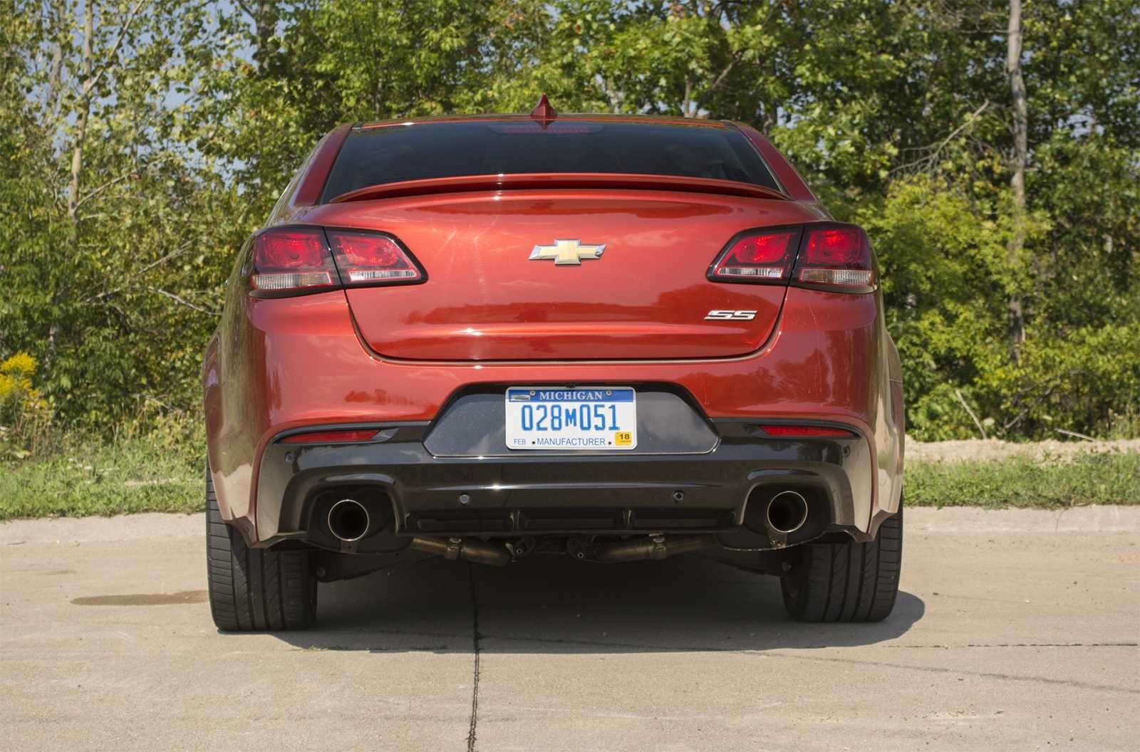 The rear of the 2015 Chevrolet SS shows a wide, flat decklid with a prominent gold bowtie emblem and SS badge on the passenger side, flanked by slim wraparound taillights. Dual exhaust tips emerge from a black lower diffuser, making clear this is no ordinary family sedan.