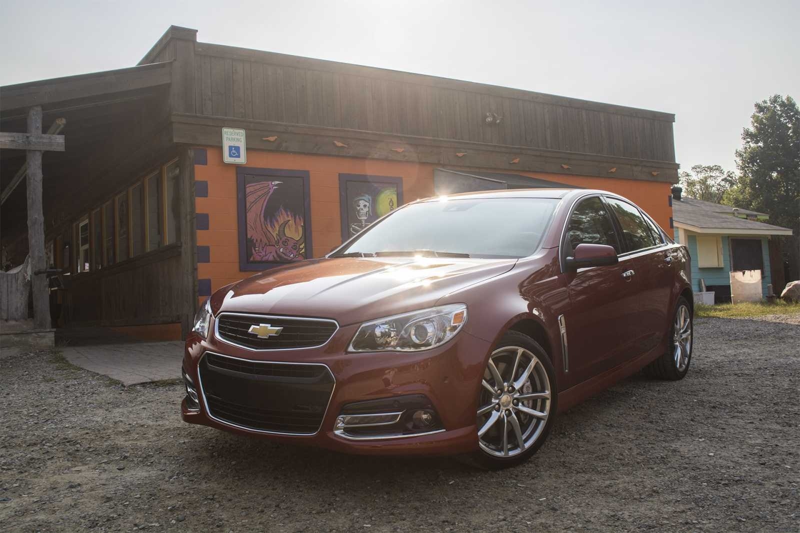 The 2015 Chevrolet SS is parked in front of a brightly painted roadside building with eclectic artwork, the deep red sedan glinting in late-morning sun. The SS's wide stance, projector headlights, and dual-port grille with gold bowtie command attention against the vivid backdrop.