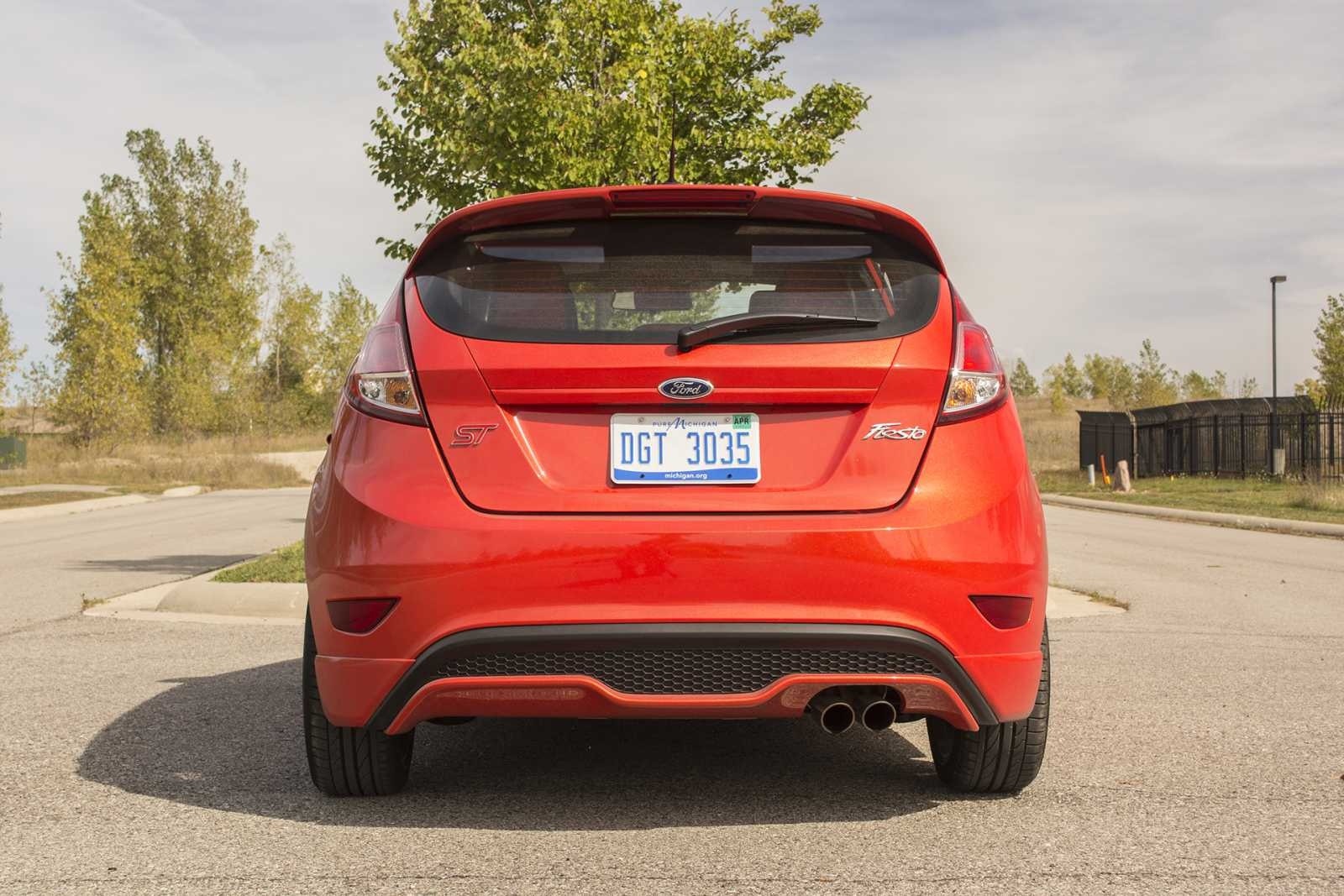 The rear of the 2015 Ford Fiesta ST in Race Red features an integrated roof spoiler, ST badge on the liftgate, and a dual center-exit exhaust below the black mesh rear diffuser. The hatchback's wide stance and wraparound taillights give it a purposeful, sporty tail.