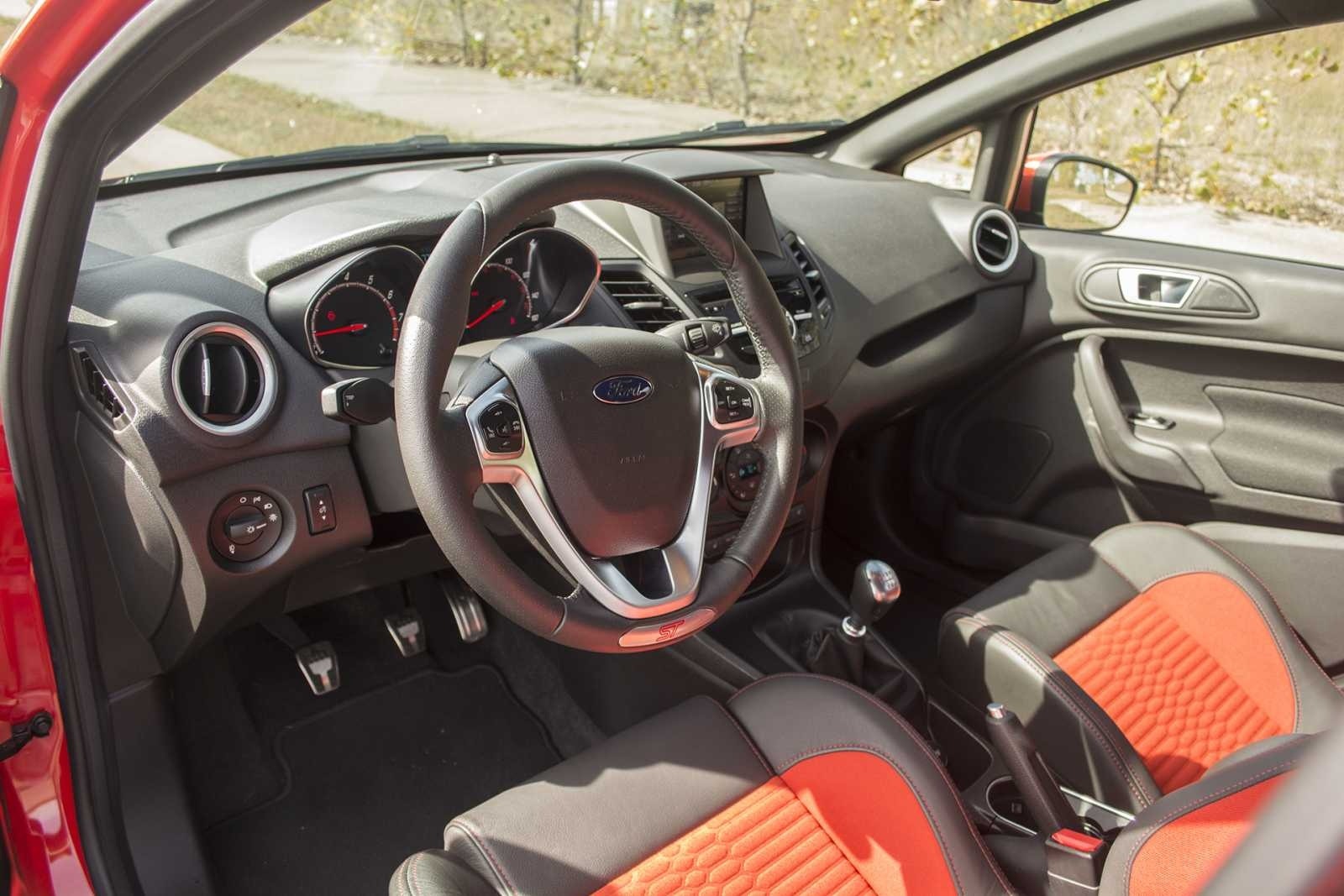 The 2015 Ford Fiesta ST's driver-side interior shows a leather-wrapped sport steering wheel with orange accent stitching, a digital instrument cluster with red detailing, and the SYNC infotainment system at the top of the center stack. The orange and black Recaro seat inserts continue the exterior color scheme into the cabin.