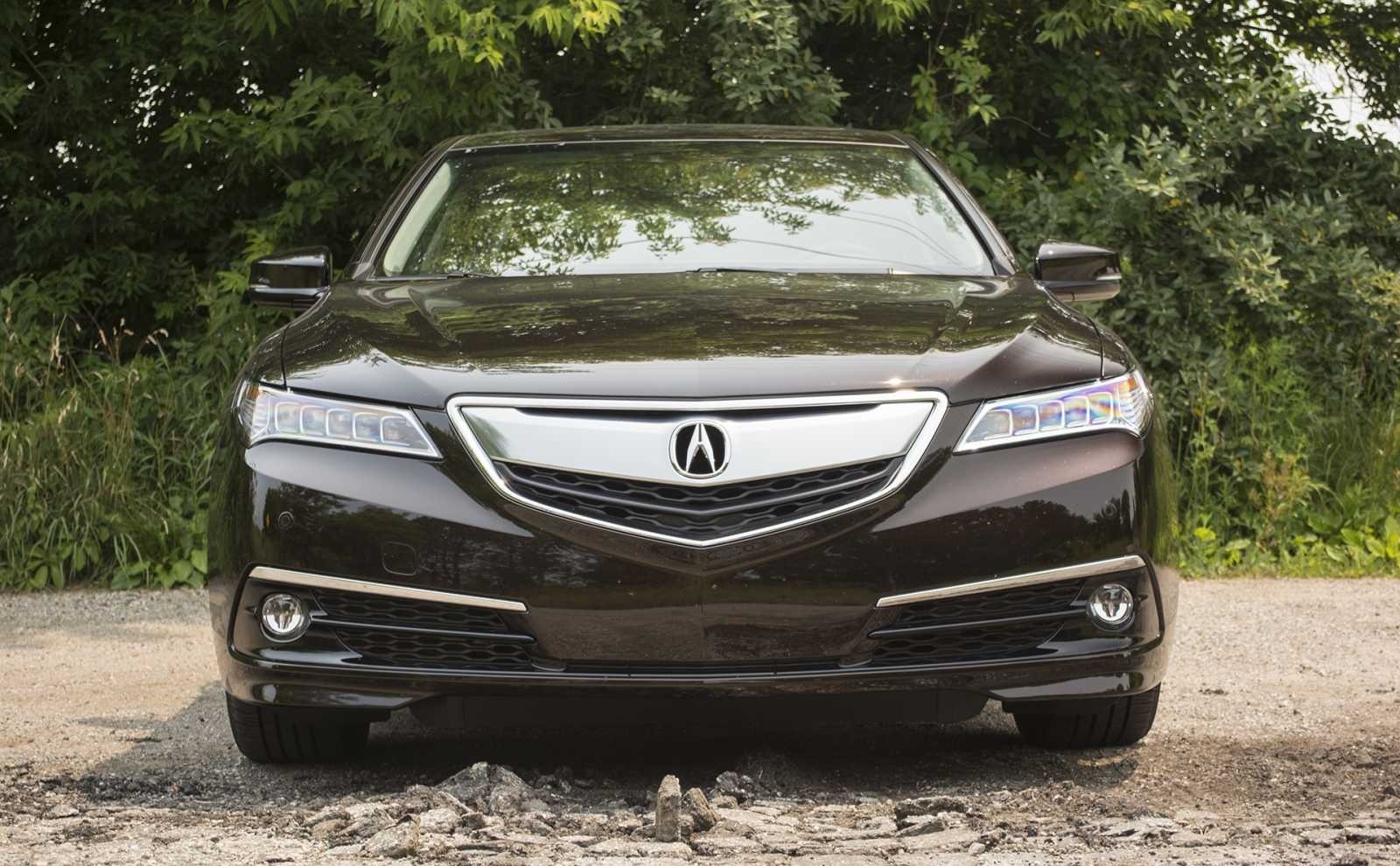 The 2015 Acura TLX SH-AWD faces the camera in a deep brown exterior, its bold diamond pentagon grille flanked by jewel-eye LED headlights and chrome trim. The wide, planted front end signals the all-wheel-drive sedan's combination of luxury and performance.