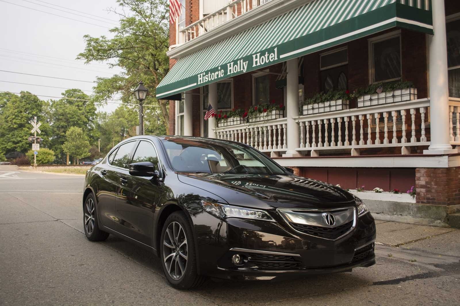 The 2015 Acura TLX SH-AWD in dark brown is parked in front of the Historic Holly Hotel in Holly, Michigan, its front three-quarter stance showing the jewel-eye LED headlights, diamond pentagon grille, and split-spoke alloy wheels to advantage. The setting suits the TLX's position as a refined, performance-oriented luxury sedan.