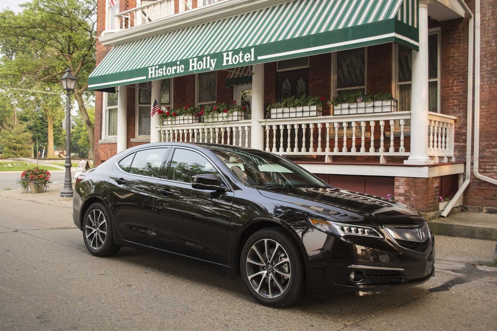 The 2015 Acura TLX SH-AWD in dark brown is posed in front of the Historic Holly Hotel in Holly, Michigan, the Victorian architecture providing a fitting backdrop for the luxury sedan's refined profile. The TLX's clean lines and 19-inch alloy wheels are well-framed by the street-level perspective.