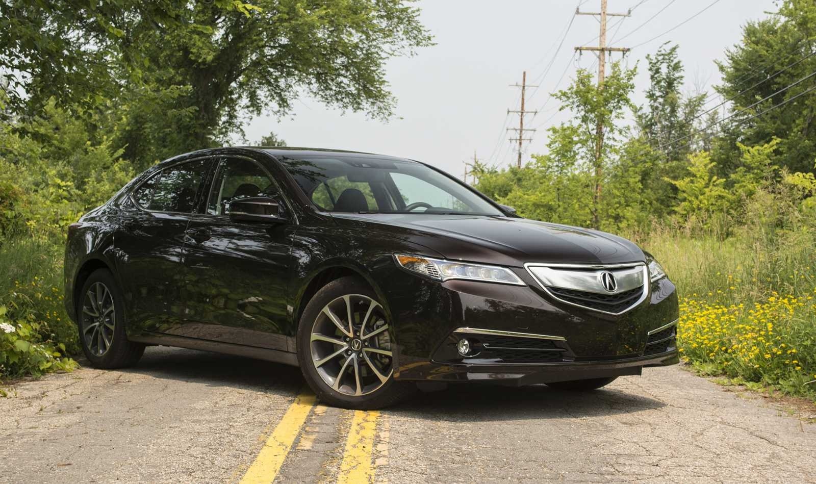 The 2015 Acura TLX SH-AWD is photographed from the front three-quarter on an overgrown country road, its dark brown finish contrasting with wildflower-lined surroundings. The planted stance, 19-inch alloys, and LED headlights give the all-wheel-drive sedan an imposing, capable look.