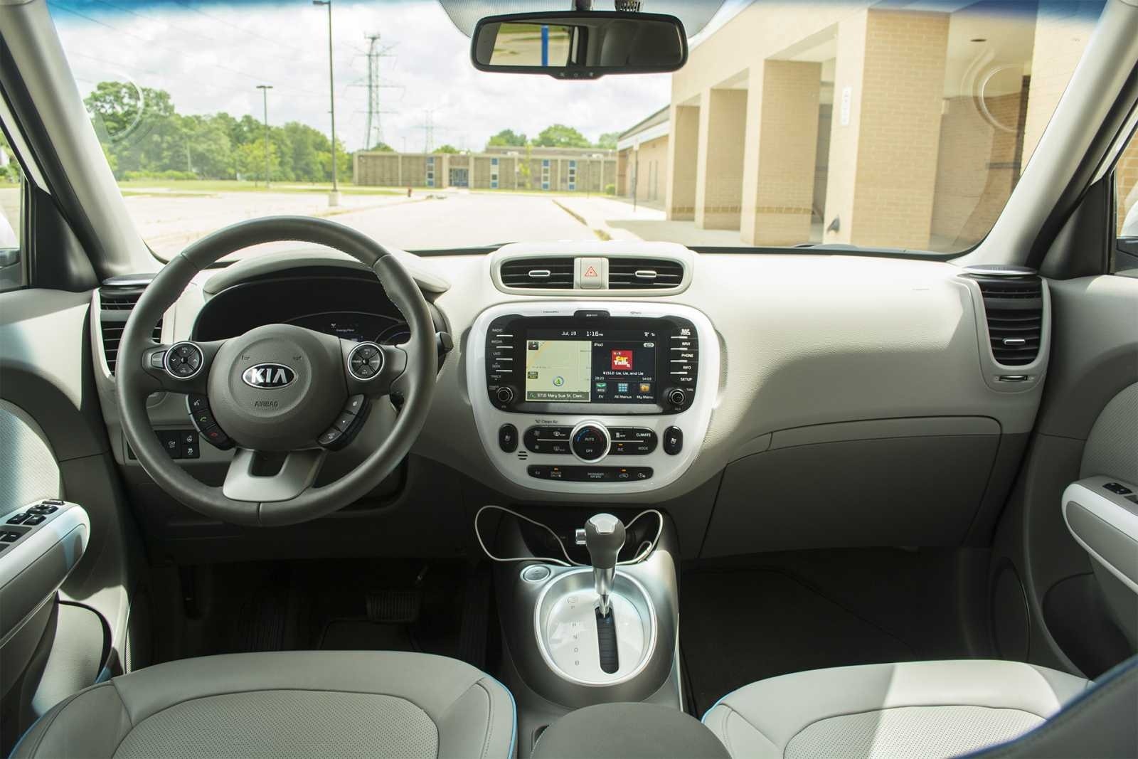 A wide view of the 2015 Kia Soul EV's interior taken from the rear seat shows the full-width dashboard, centrally mounted navigation touchscreen, and the airy two-tone white and gray cabin. The EV gear selector and panoramic windshield create a spacious, modern feel suited to urban commuting.