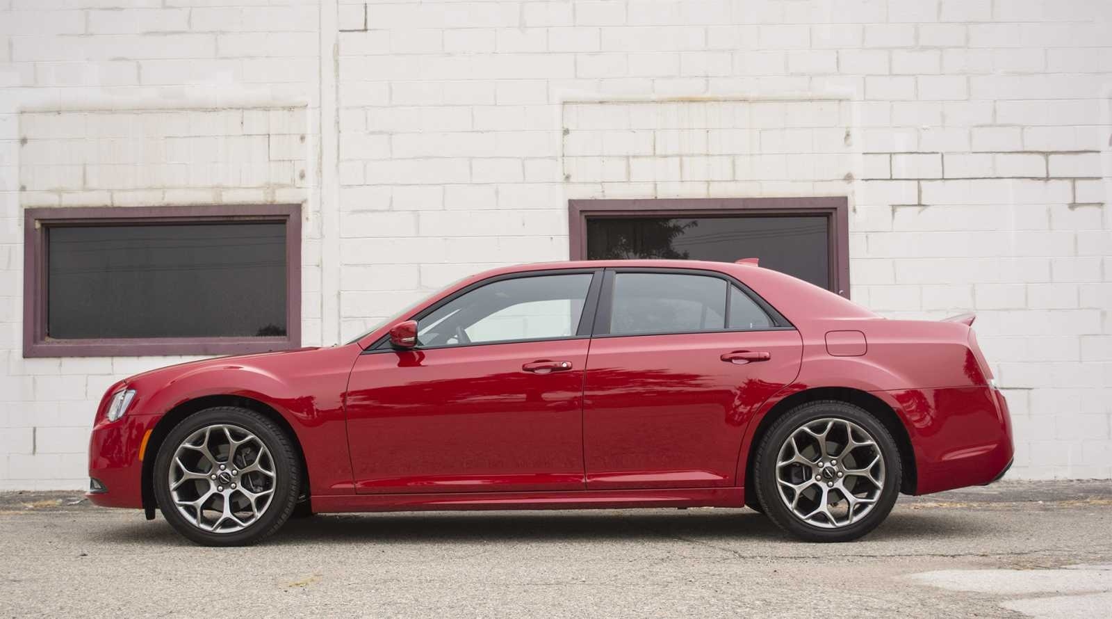 The side profile of the 2015 Chrysler 300S reveals its long, low, and wide sedan silhouette, with a fastback-style roofline flowing into a trunk-mounted spoiler. Dark multi-spoke alloy wheels fill the arches of the red exterior, giving the 300S an authoritative road presence.
