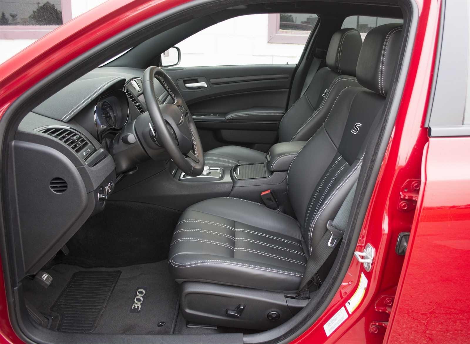 Viewed through the open driver's door, the 2015 Chrysler 300S shows off its sport seats embossed with the "S" logo alongside contrast-stitched black leather and "300" embroidered floor mats. The cockpit layout puts controls close at hand for a confident, connected driving feel.