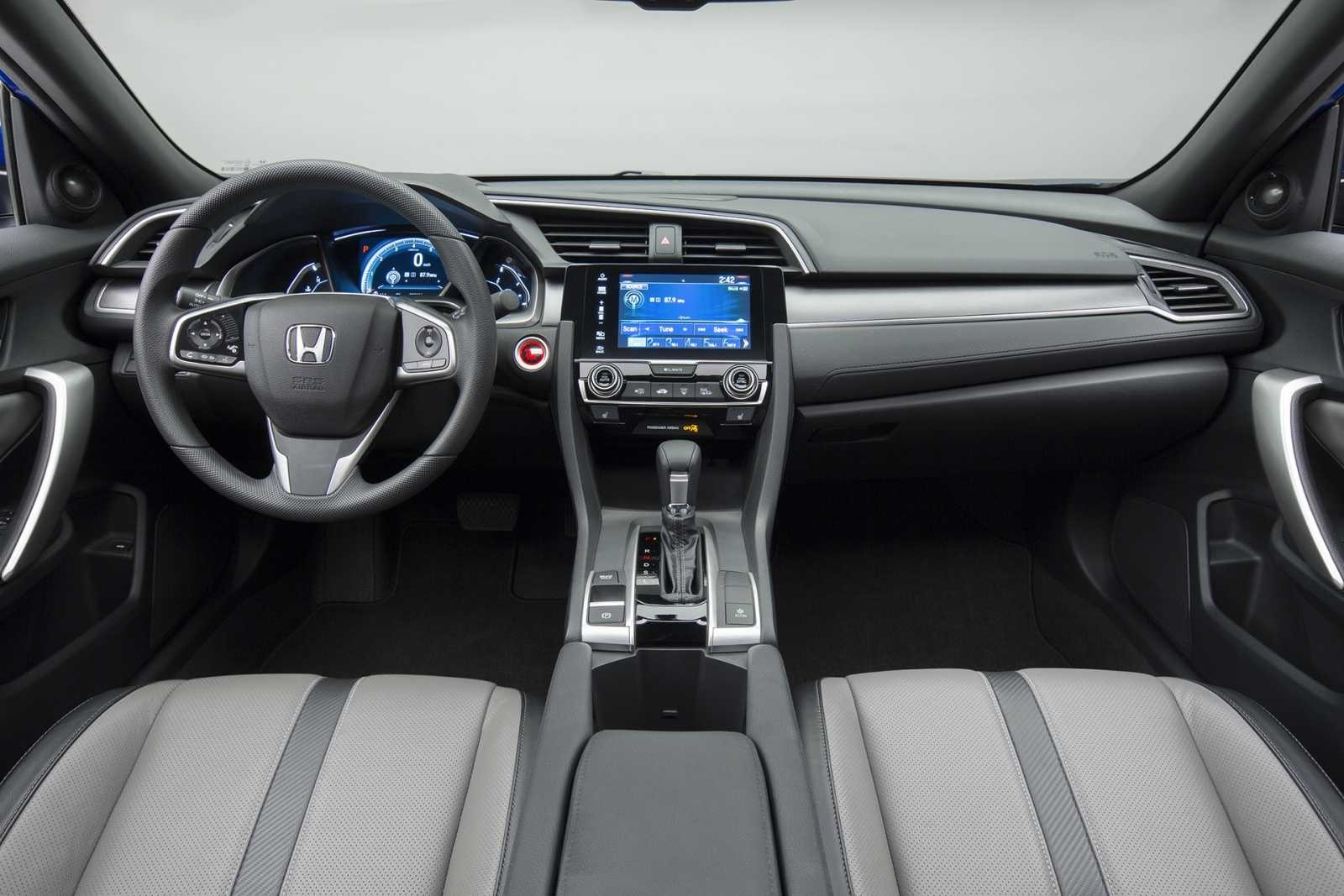 The 2016 Honda Civic Coupe's cockpit-inspired dashboard features a digital instrument cluster with blue illumination, a 7-inch touchscreen infotainment system, and a center console with a push-button ignition and automatic gear selector. Gray cloth seating and a clean horizontal dash layout give the interior a modern, driver-focused feel.