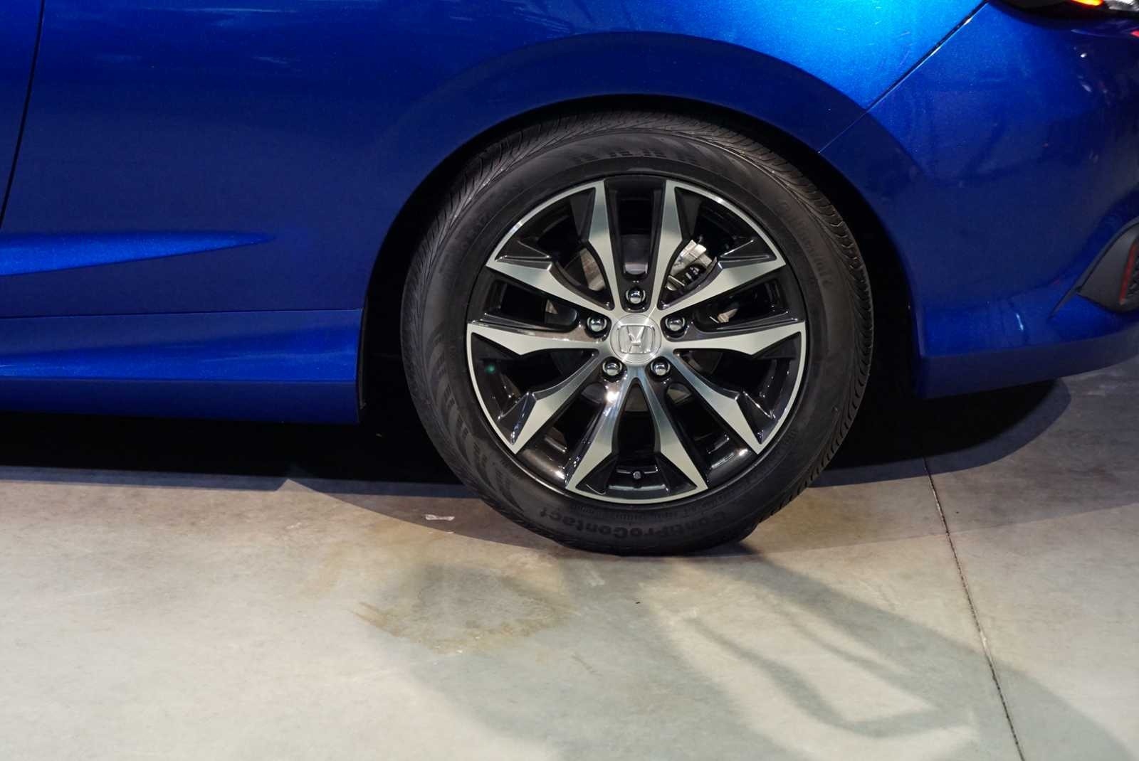 A close-up shot taken at the 2015 LA Auto Show showcases the 2016 Honda Civic Coupe's 10-spoke machine-finished alloy wheel with the Honda center cap. The lower body crease and vibrant blue paint are visible above the wheel arch.