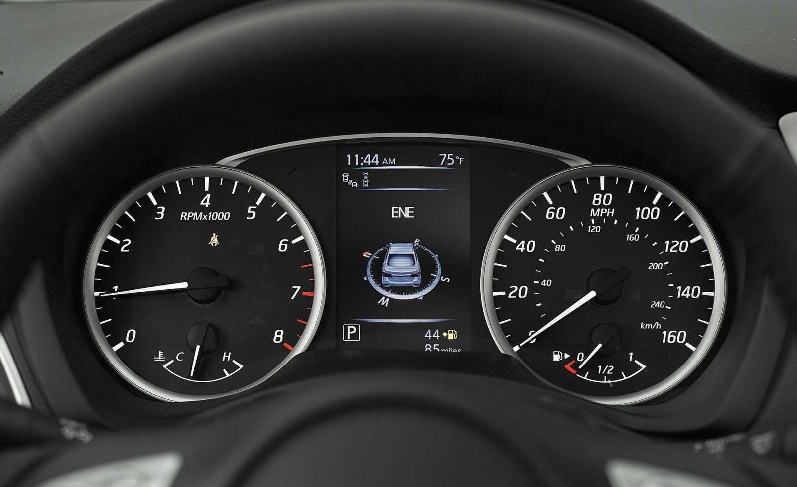 A close-up of the 2016 Nissan Sentra's dual-binnacle instrument cluster, featuring the tachometer on the left, speedometer on the right, and a center color TFT information display showing the vehicle overhead view, compass heading, and trip data. The premium gauge pod design mirrors the styling found in Nissan's larger sedans.