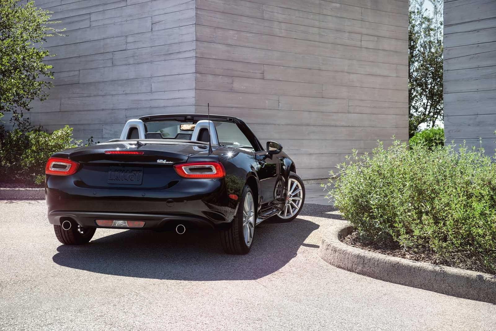 The 2017 Fiat 124 Spider in black is shown from a low rear three-quarter angle next to a concrete architectural wall with the soft top down. The rectangular LED taillights, 124 Spider badge, dual exhaust tips, and multi-spoke alloy wheel are visible in this exterior detail shot.