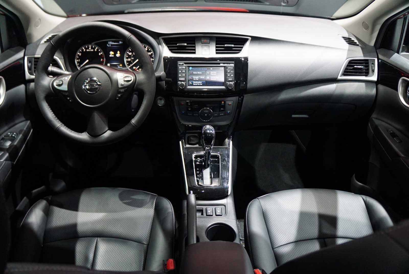 The 2016 Nissan Sentra interior shows the redesigned dashboard with a centrally mounted touchscreen infotainment display, leather-wrapped steering wheel with Nissan badge, automatic shifter, and dual-tone black and gray seat upholstery. The updated cabin features improved materials and a more modern layout compared to the outgoing model.